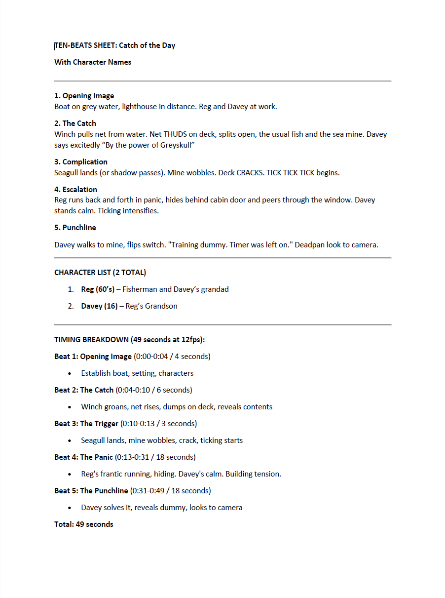 The beat sheet in particular helped me ensure the pacing worked within the short runtime. Each action has to justify its screen time, especially in a piece under a minute. The updated beats now focus more clearly on cause and effect, allowing the humour and tension to emerge visually rather than through unnecessary action.