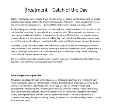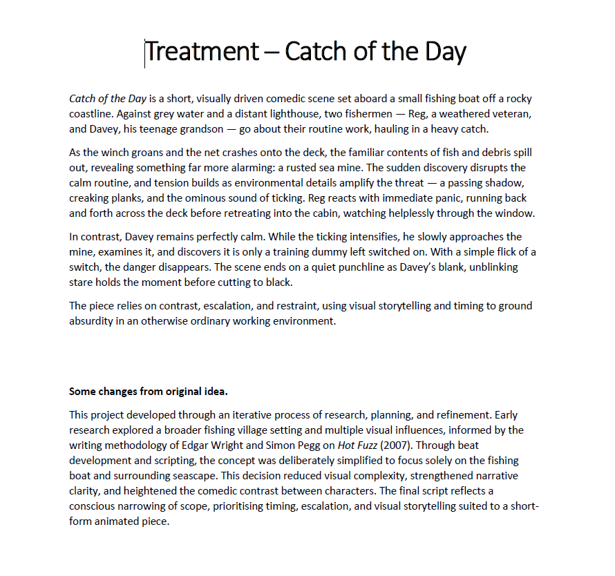 One thing I was particularly conscious of was tone. Catch of the Day balances comedy with a sense of threat, and the treatment now reflects that tonal shift more deliberately. This will be useful when I move into storyboarding, as it gives me a consistent emotional baseline to work from.