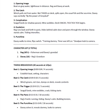This post is a progress update on my stop motion project Catch of the Day and marks a really important transition point. Over the past week I have refined the core story documents by updating the beat sheet, tightening the treatment, and reworking the script into a clean, industry-standard format. This stage has been less about adding new ideas and more about clarity, intention, and making sure every creative decision is locked before I start building physical assets.
