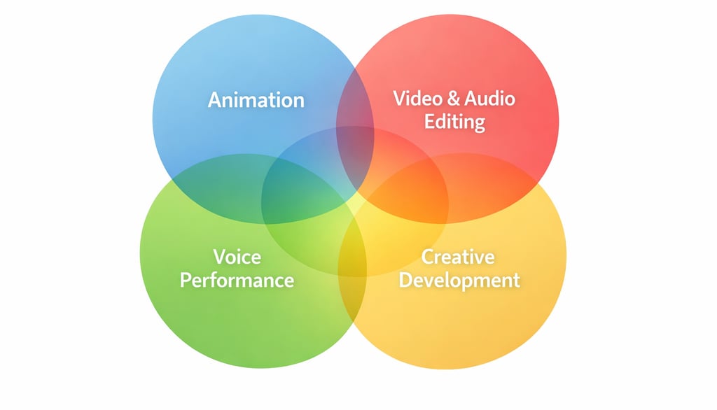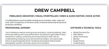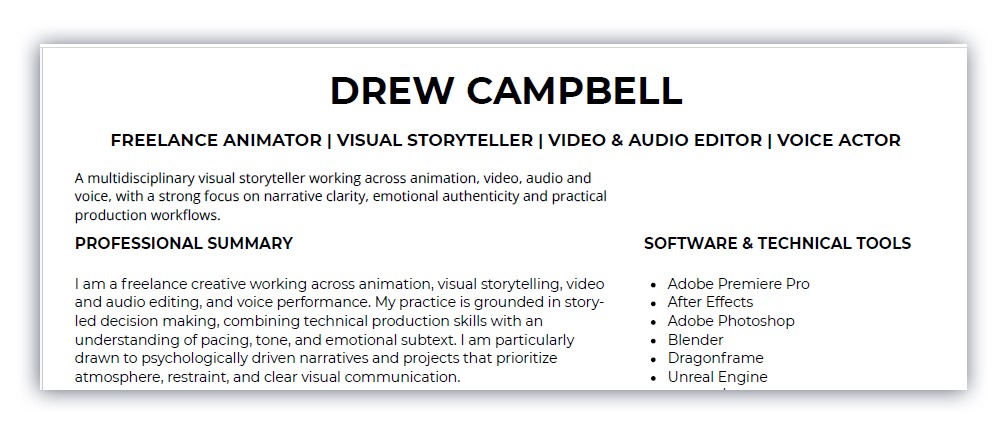 Rather than presenting myself as several disconnected roles, I now see my identity as that of a visual storyteller, using different tools depending on the needs of a project. Animation, editing, and voice are not separate strands, but complementary ways of shaping narrative and emotional clarity. This perspective has helped me make more confident decisions about how I present my work professionally, particularly within my CV and portfolio.