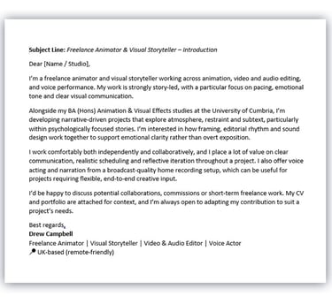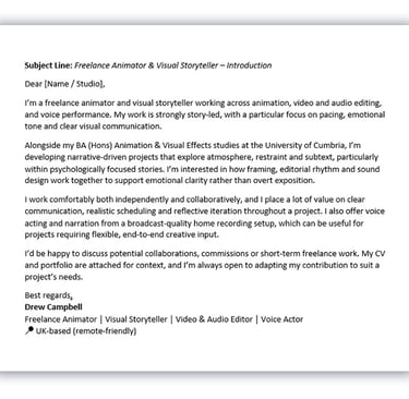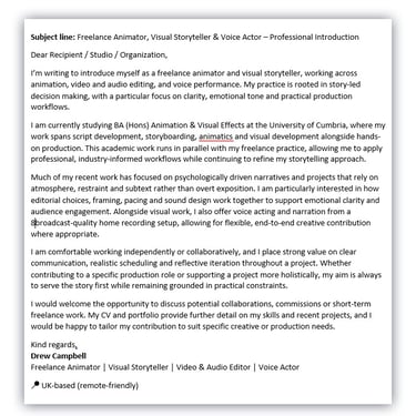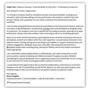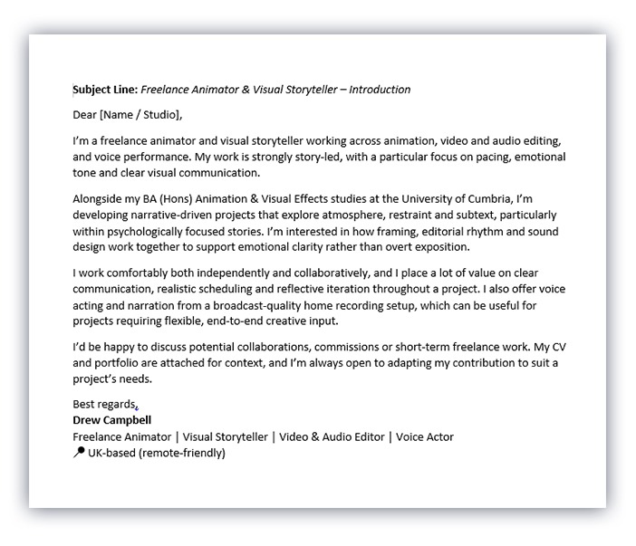 Alongside the CV, I developed two versions of a cover letter: a longer professional introduction and a shorter, email-first pitch. Both are framed as freelance introductions, emphasising storytelling, collaboration, and practical workflows rather than formal job application language.