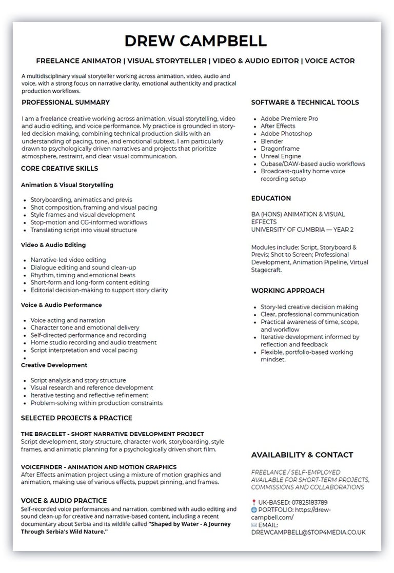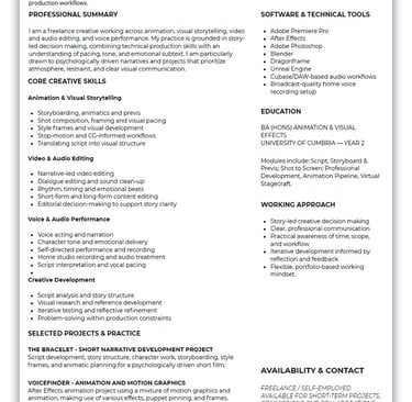 Instead of presenting a full chronological employment history, my creative CV prioritises skills, process, and selected project work, mirroring how freelance animators and visual storytellers are typically introduced to studios and collaborators.