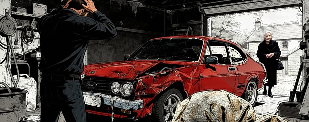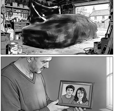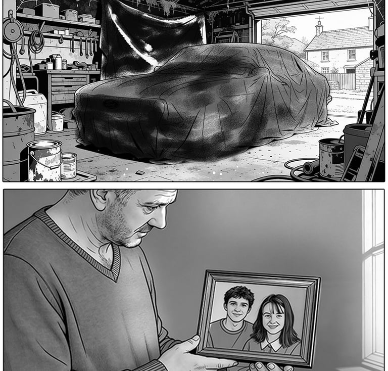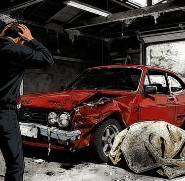 Fig.4. Visual development of James discovering the damaged car in the present day, using the object as a contained trigger for guilt rather than depicting the accident itself. (Generated using Freepik, 2025