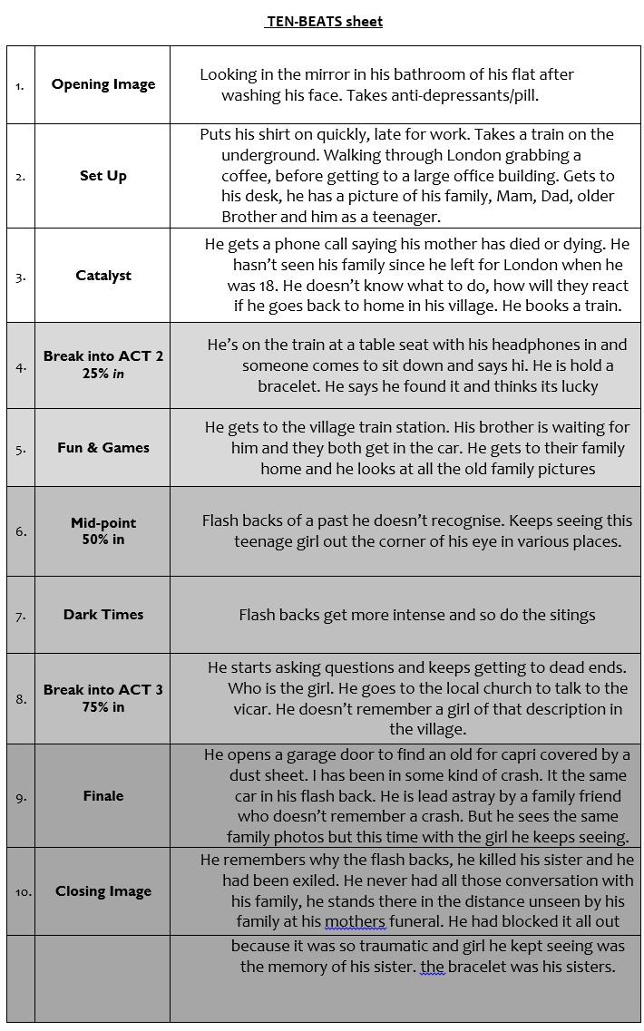 During the session, I applied this directly to my own story, The Bracelet. Working through the beat sheet live in class, I managed to create a complete first draft in around twenty minutes. That speed was revealing. Instead of overthinking individual scenes, the beat sheet forced me to focus on the function of each moment, what changes, what information is revealed, and how the emotional stakes shift.