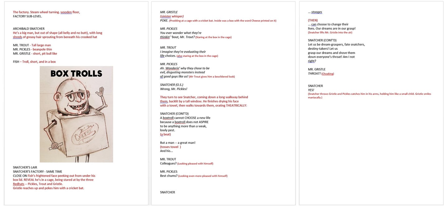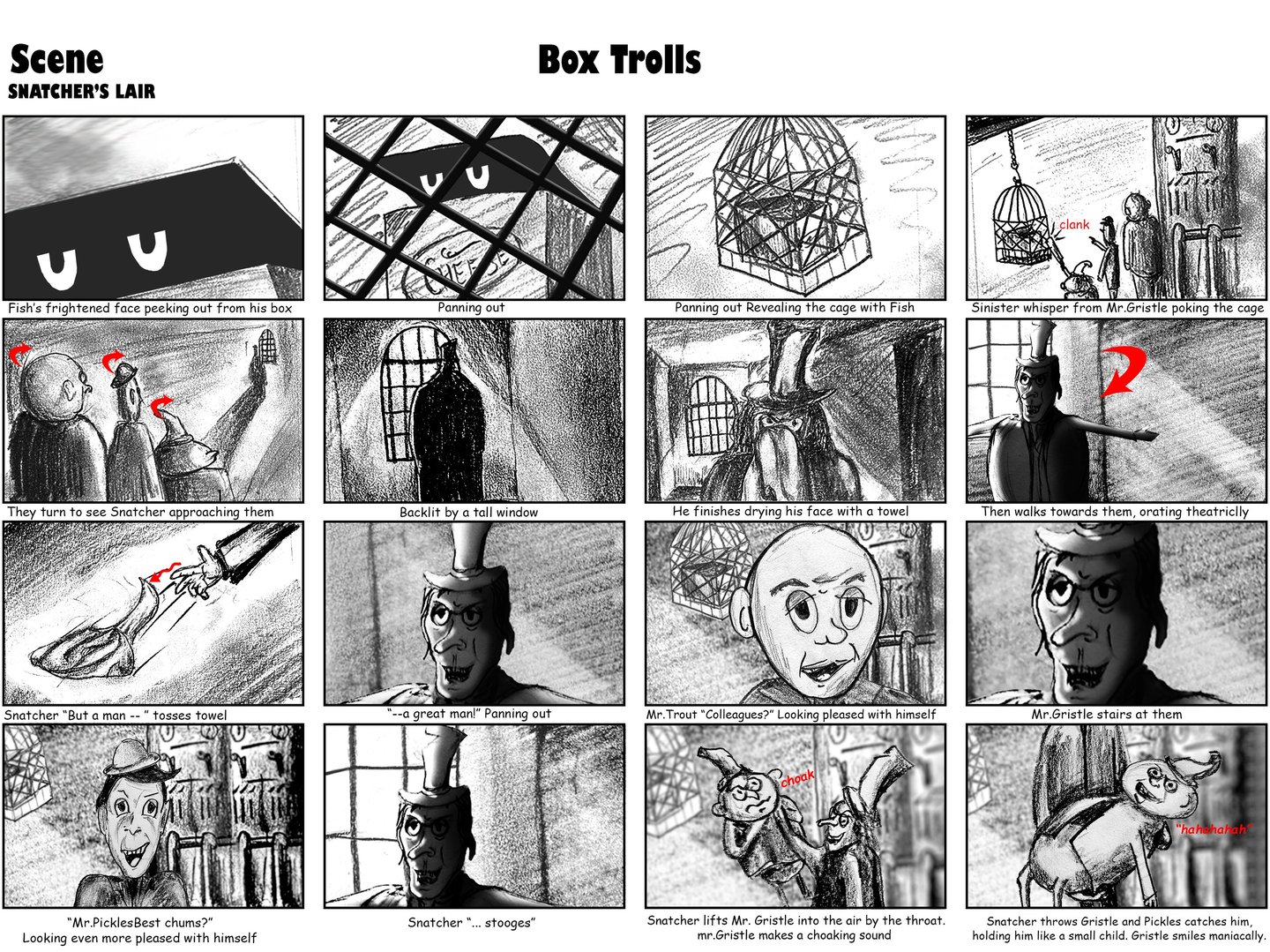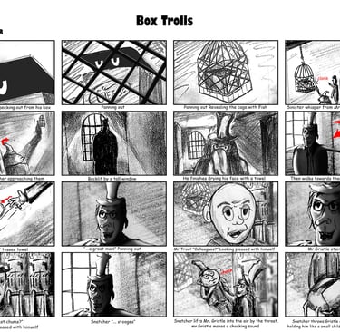I selected The Boxtrolls as my script. Having never seen the film, aside from a single viewing of its trailer, I approached the task without preconceived notions. This allowed me to craft my own interpretation, ensuring my storyboard reflected an independent vision rather than being influenced by the movie’s existing scenes.