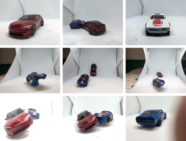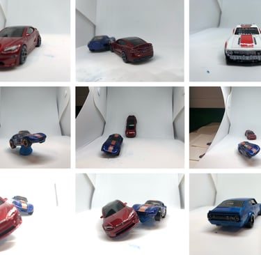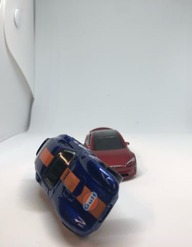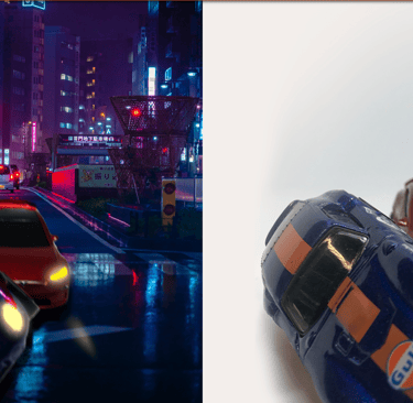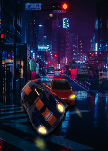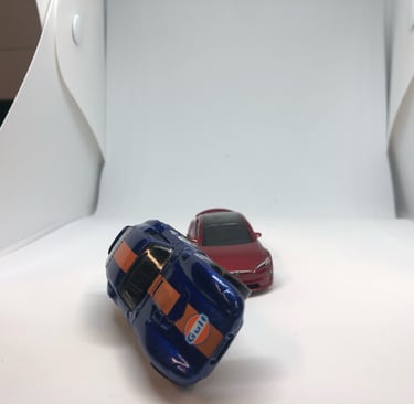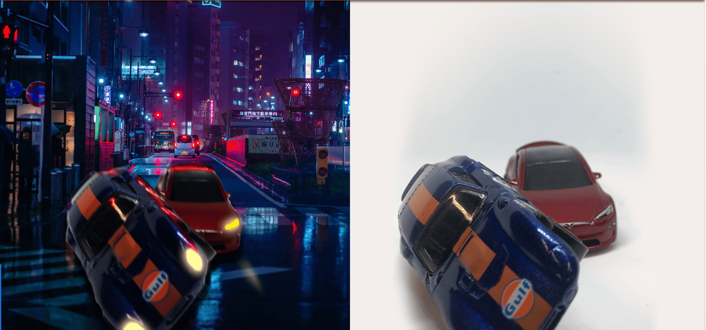I used a small LED Light Photo Studio Box to take pictures of various angles of both cars. I then took one of my favourites and brought it into Photoshop, used a Tokyo Street background and placed them into the scene after I had edited the cars. I added some light effects and some motion blur. Before and after shots below.