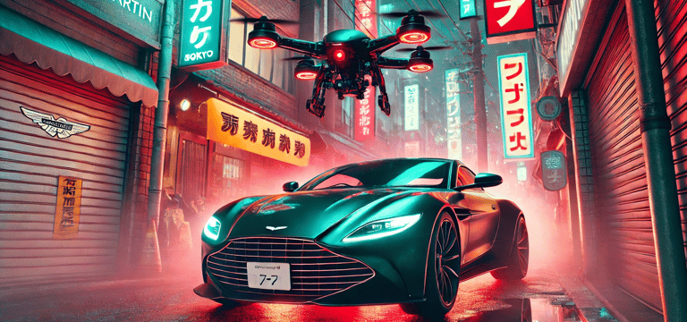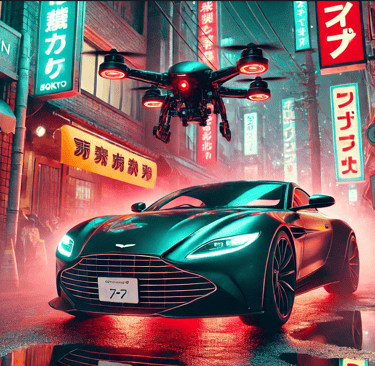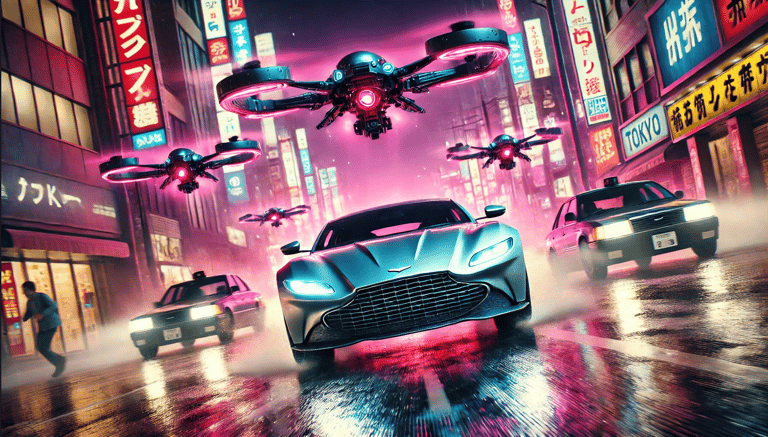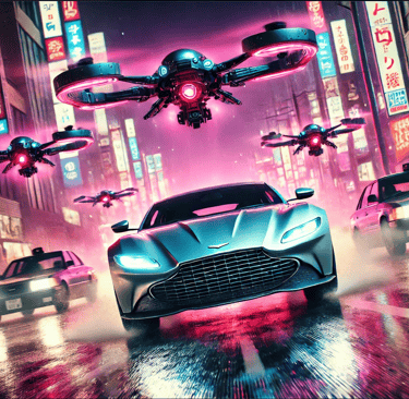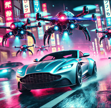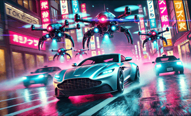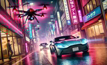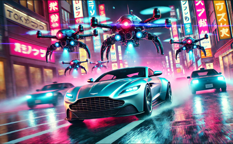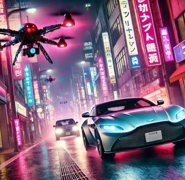 Sam has just stolen a crucial piece of technology from a corrupt corporation that plans to use it for mass surveillance. As he speeds through the neon-lit streets of Tokyo in his modified Aston Martin, he's pursued not by humans but by a fleet of AI-controlled drones. The twist? The drones are programmed to adapt and learn from Sam's driving patterns, making the chase increasingly difficult.