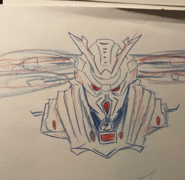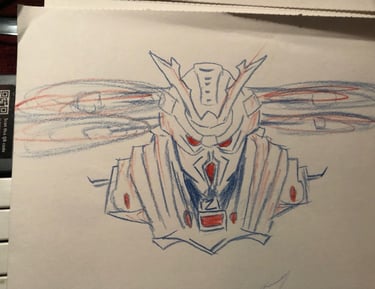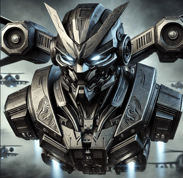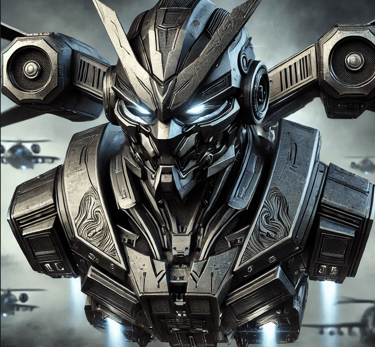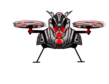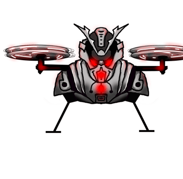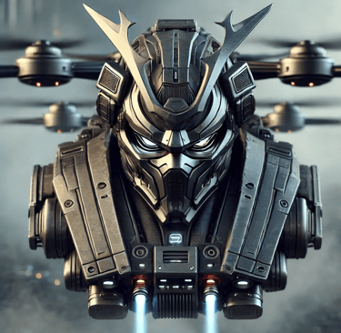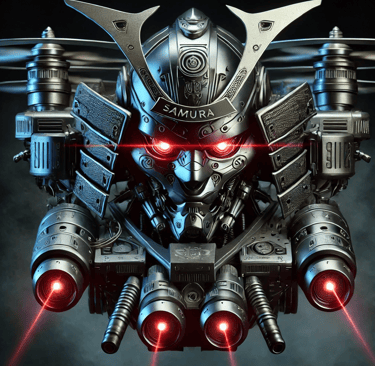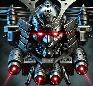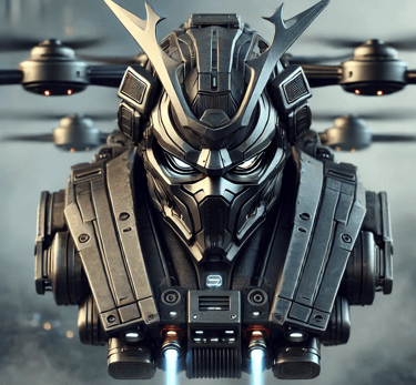 Prompt: Can you create an image of a futuristic armed drone with the look of a scary samurai mask with bright red laser eyes