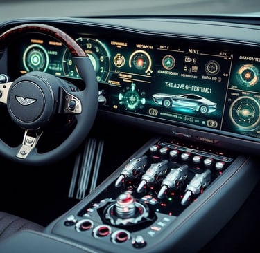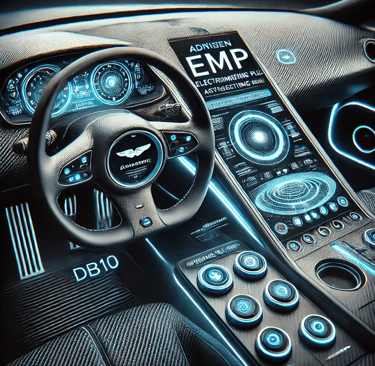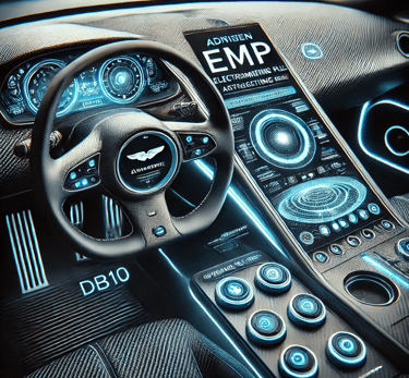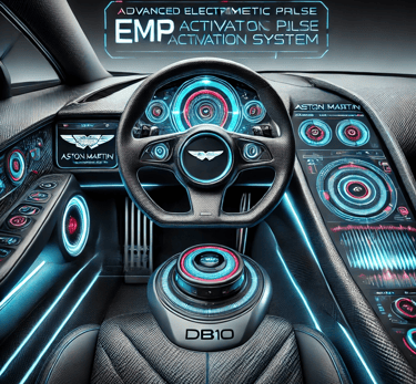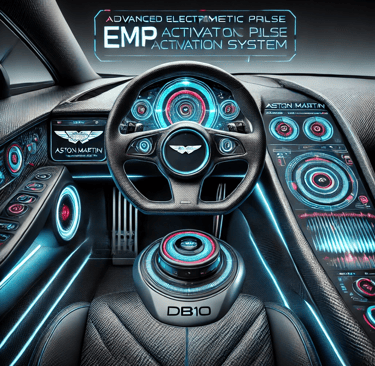 Prompt: Can you create an image of a futuristic-looking EMP device that is incorporated into an Aston Martin DB10 dashboard