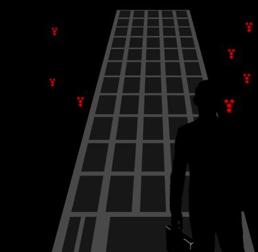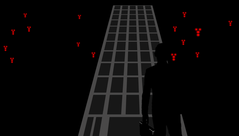 Action: He jumps into his modified Aston Martin after seeing a multitude of red glowing lights around the darkened building. He speeds off as alarms blare in the background.