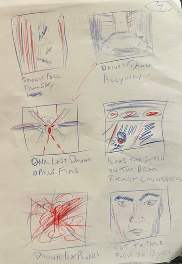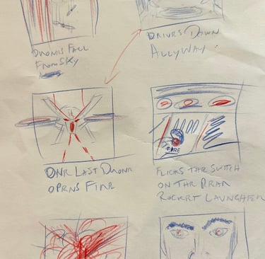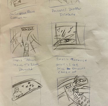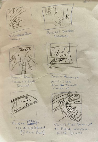 The next step was to outline the storyboard for the animatic. I had enough still images of my favourite movie chases and the Hot Wheels images to provide a clear vision of what I was aiming for. I also sketched out the drone and finished it in Photoshop along with other elements for the animatic, including the Aston Martin DB10.I had