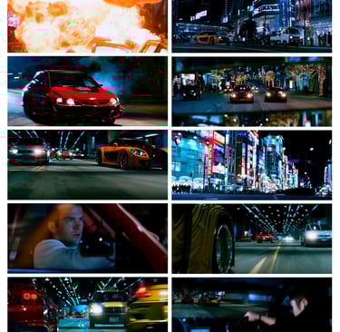 In connection with the "Bullet Chase" scene, I imported the car chase sequence from "Fast and Furious: Tokyo Drift" into Premiere Pro and performed a scene edit detection. I then identified and selected the most impactful frames to craft a 30-second chase sequence, clearly outlining the necessary frames and cuts to support my project research.