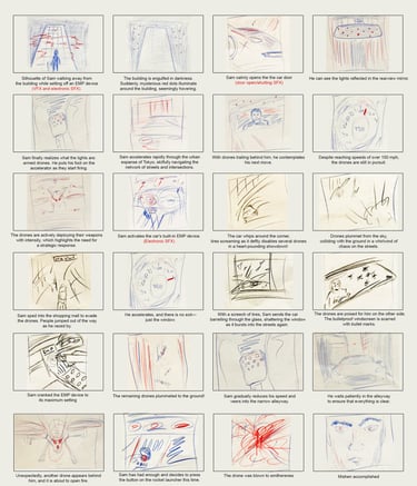 To begin visualising the sequence, I created several initial blocking shots using Photoshop (see example on the right). Guided by the storyline and supported by visual references, I then sketched the storyboard. At this stage, the focus was not on fine detail, but on capturing the core action and movement within each scene. I also began experimenting with the placement and flow of vehicles to establish spatial continuity and narrative rhythm.