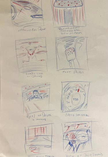 To inform the visual storytelling of my car chase animatic, I recorded reference footage using an iPhone mounted to a dashboard phone holder, positioned to face the road ahead. This approach simulated the driver's perspective, offering valuable insight into how motion, traffic, and urban architecture interact in real-time. The footage helped me study the dynamic framing of buildings, the shifting vanishing points, and the rhythm of road movement—key elements in crafting a believable and engaging chase sequence.