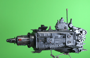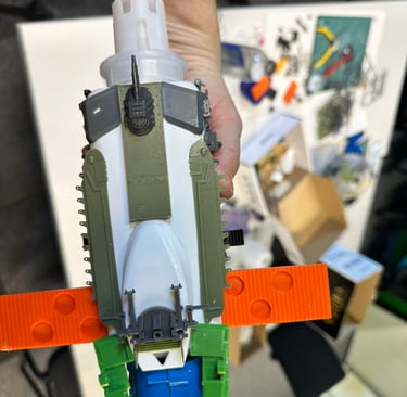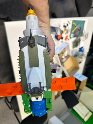 I found the main body of the ship in one of the boxes, a shampoo bottle. Its oblong shape immediately gave me a sense of form. From there, I started gathering additional parts to refine its structure. A pump mechanism from a cleaning product became the ship’s nose, defining its overall shape. I also sourced model pieces that were ideal for the captain’s bridge and the rear section housing the rockets. To ensure proper paint adhesion, I wet-sanded all these components, including the bottle.