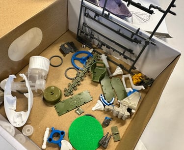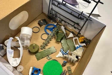 I'm captivated by the intricately crafted models seen in sci-fi films and television, so I had plenty of ideas swirling in my mind. However, it wasn’t until I came across a box of assorted materials that Sam, our technician, had sourced for us that I started to develop a clearer vision of its shape.