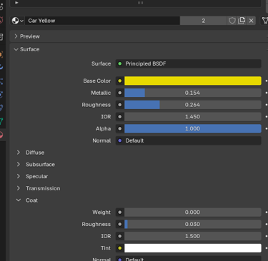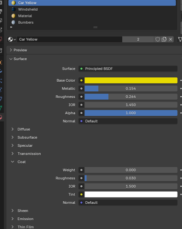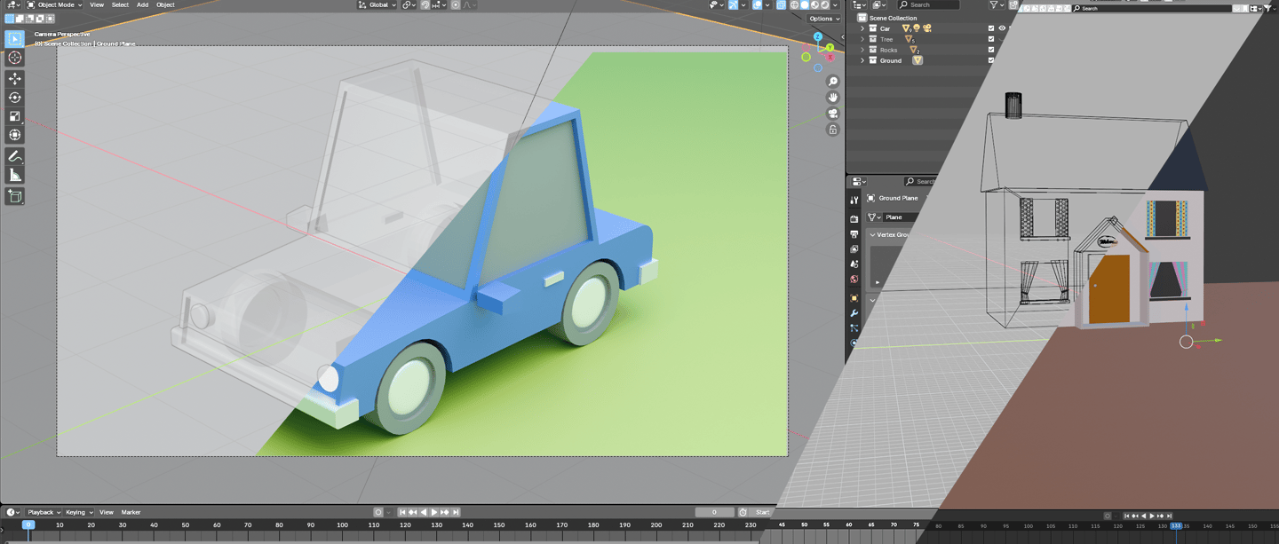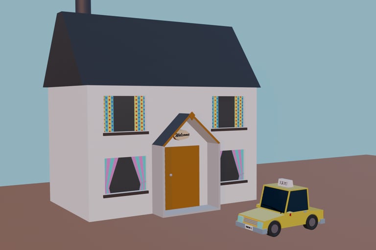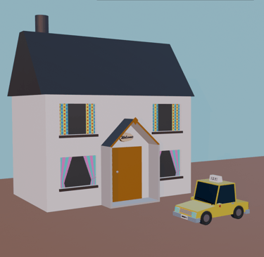 In terms of materials, I applied the same approach to colour as I did with the car, using the Material Properties panel to assign bold, contrasting colours to different parts of the models. This not only visually connects the house and vehicle but also maintains a cohesive aesthetic style that supports the playful, slightly surreal tone of the scene.