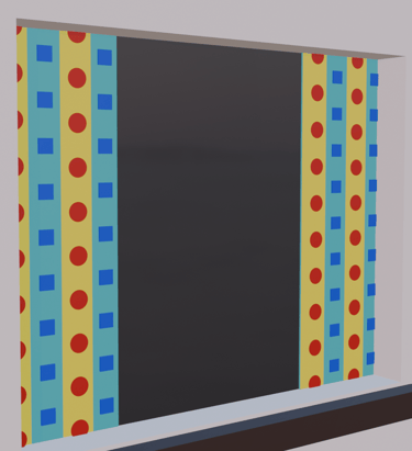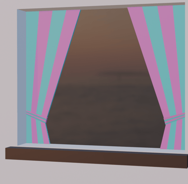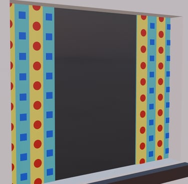 The house model was directly based on the structure I built in Task 2. I reused the same basic shape but refined the geometry to improve both proportions and visual interest. For the cartoony window curtains, I started with simple cube shapes, then added patterning using a combination of small cylinders and cubes. This method allowed for playful texture and dimensionality without overcomplicating the mesh.