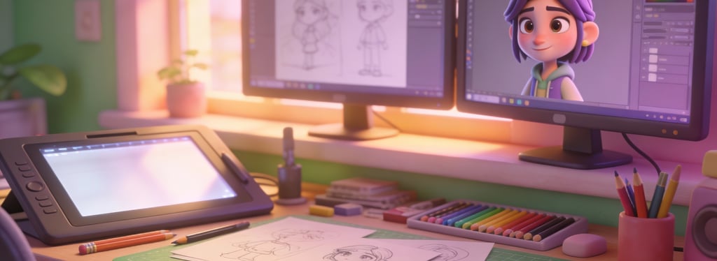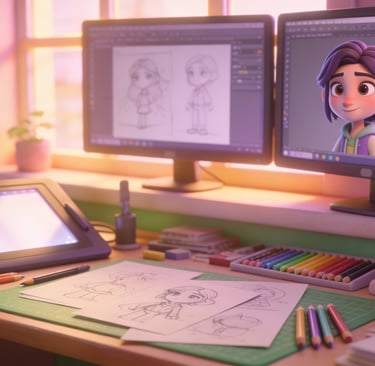 Freepik (2025) fig1. An animator's desk/workspace [AI-generated image from the prompt “An animator's desk/workspace image”]. Available at: https://www.freepik.com/pikaso/explore/S7zCxUb8dV (Accessed: 13 December 2025).