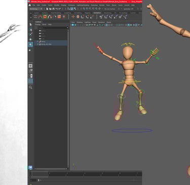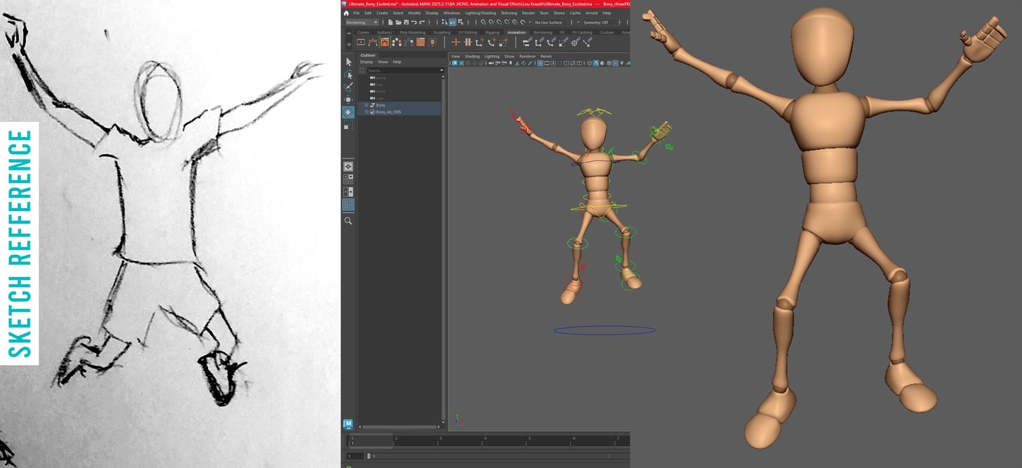 After mastering the bouncing ball, the next step was to pose my favorite excitement pose using the Bony Rig in Maya. This rig appropriately mimics the human skeletal structure, allowing you to position the limbs effectively. Started by brainstorming poses that communicate excitement, such as jumping for joy or raising hands in victory. I focused on the arc and orientation of my character's limbs to capture dynamic motion. It took me a long time to get used to posing the Bony Rig and using both IK and FK switches.