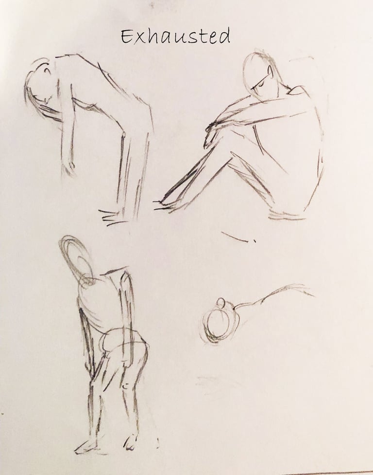 To further enhance my understanding of movement and fatigue, I engaged in sketching different human character poses that communicated exhaustion. This exercise made me appreciate the subtleties of body language and expressions. Sketching allowed me to visualize the dynamics of how a character’s posture changes under fatigue, an essential element to portray believable animation.